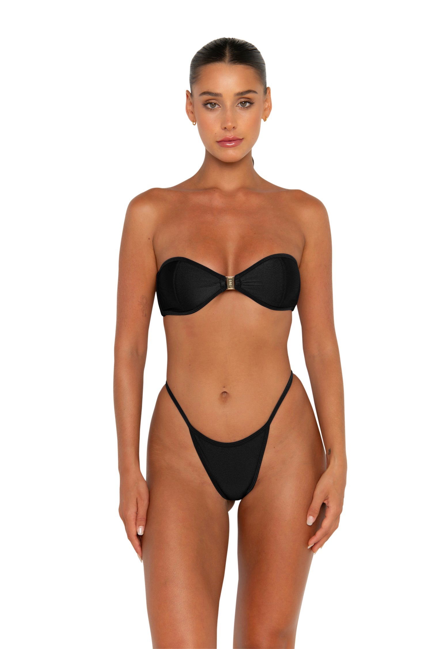 The Tallara top makes a come-back, this time with an adjustable tie back. Featuring a unique bandeau design for minimal tan lines and detailed paneling for a flattering fit, embellished with a FAE embossed gold front clasp. Crafted in the finest quality sustainable Nylon.