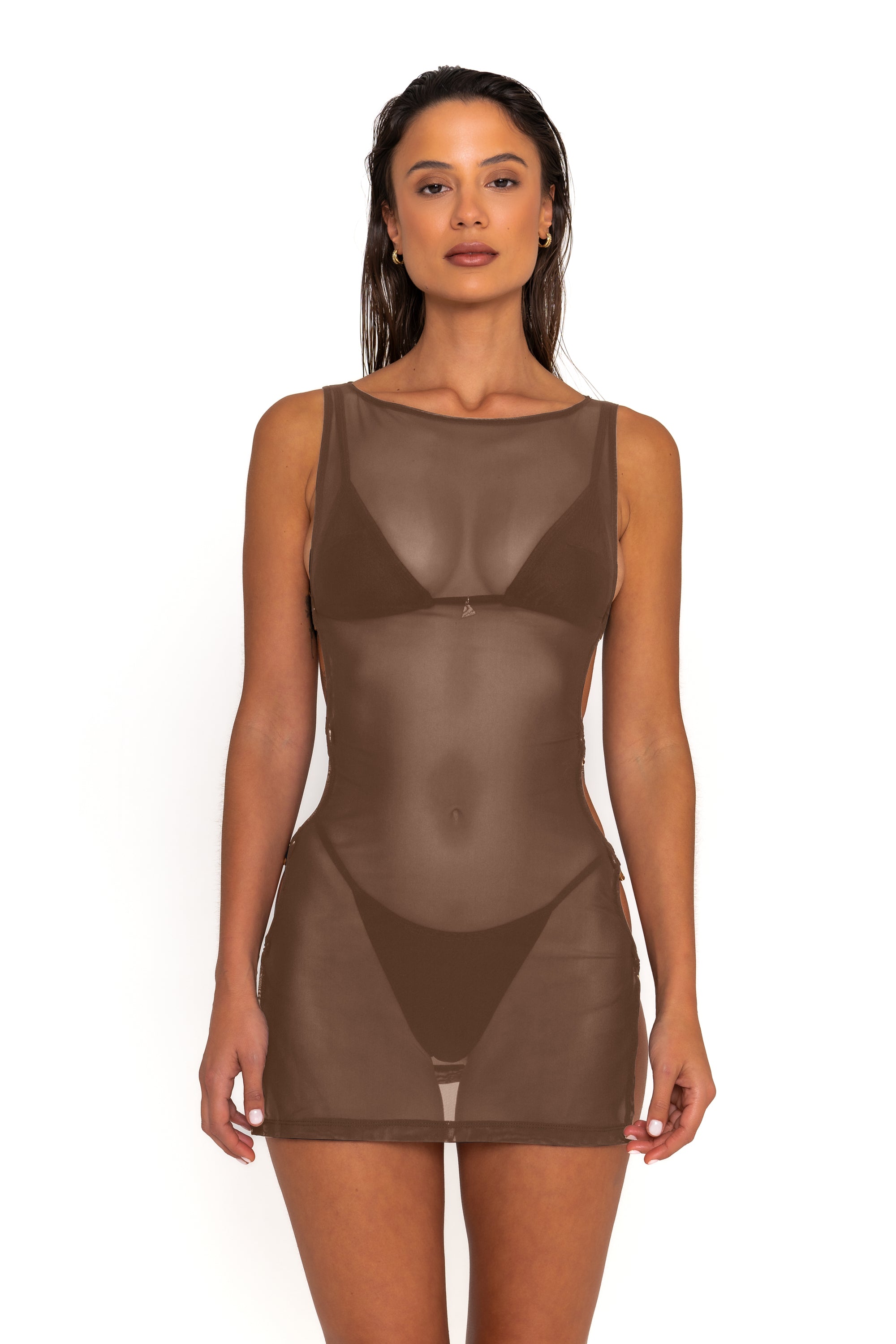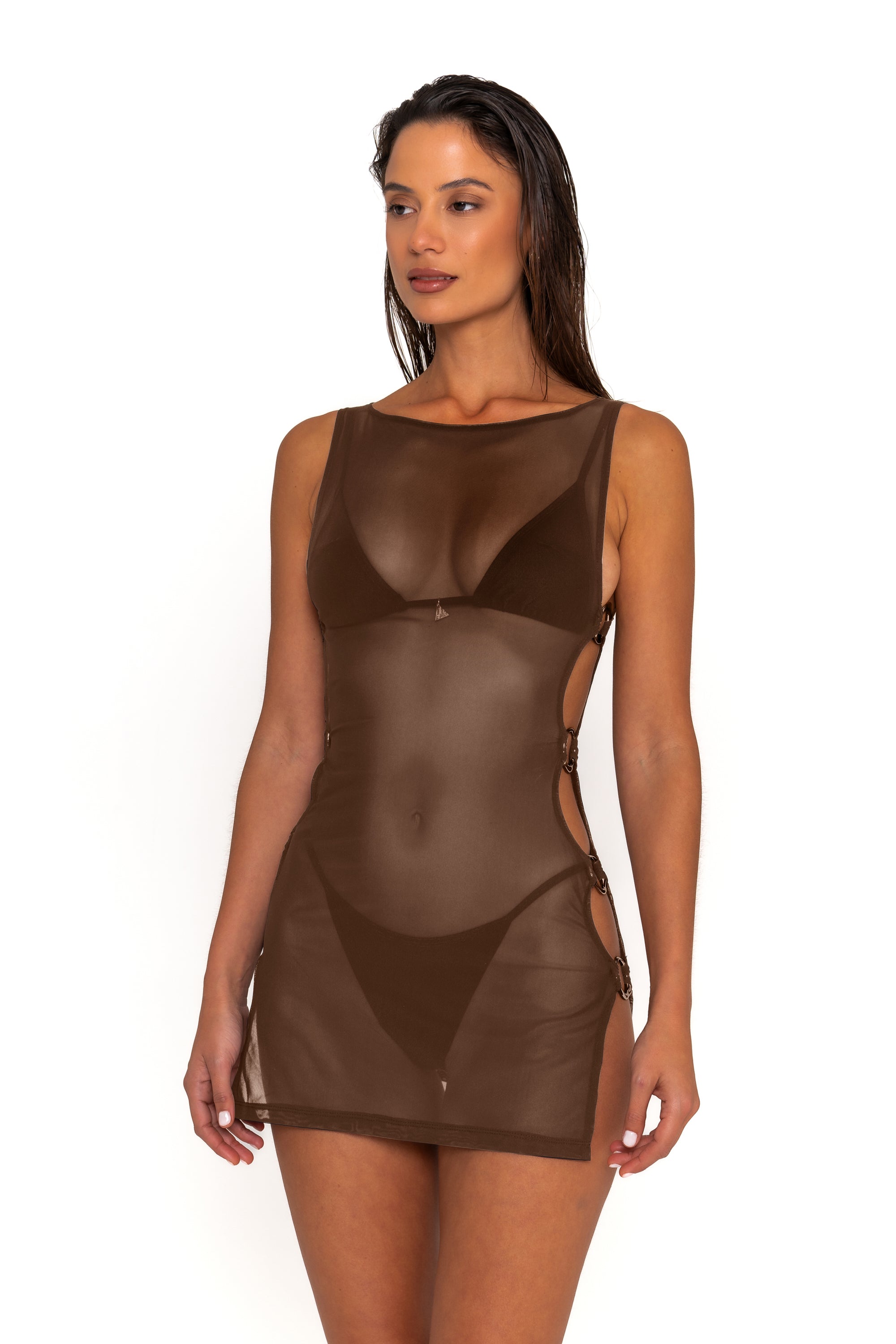 Meet the Moana Dress, crafted from recycled mesh fabric, it hugs your curves beautifully, with side cutouts and resin rings for added allure.
